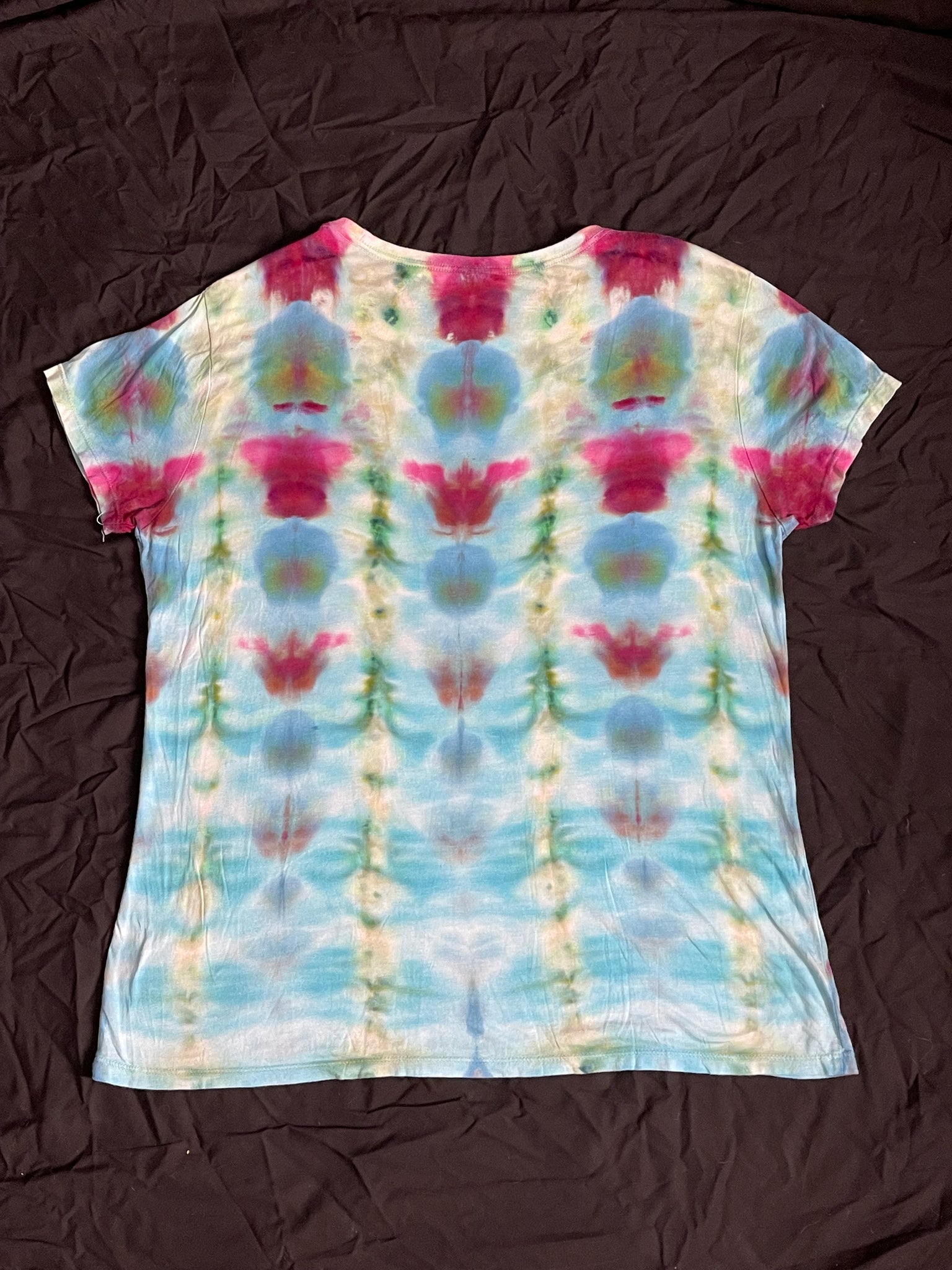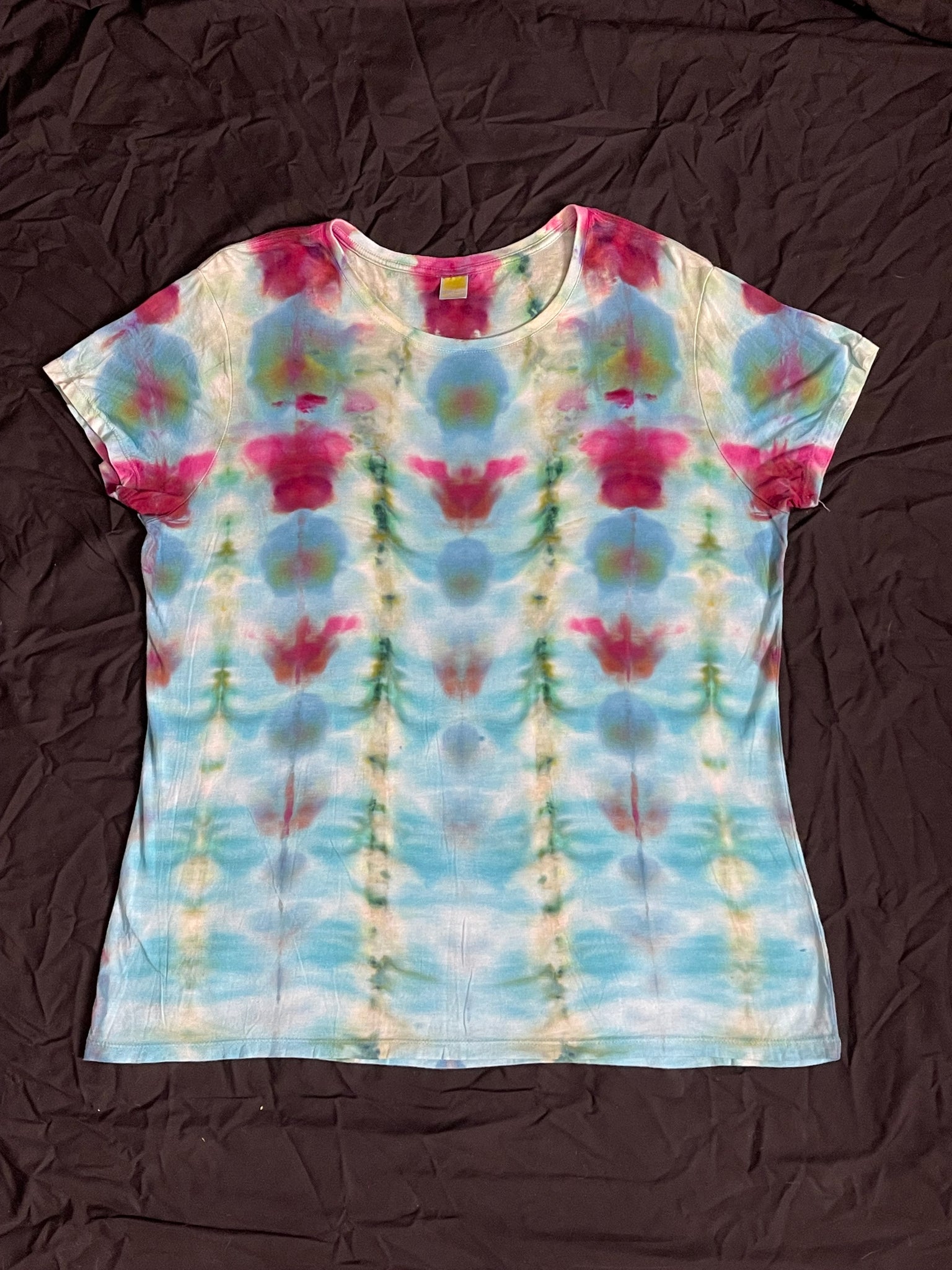 This XL women’s Onno shirt is your new favorite wearable work of art! Handmade with a unique tie-dye design on a silky smooth blend of 70% organic bamboo viscose and 30% organic cotton, it feels as light as a breeze. The side seams give it a flattering fit that moves with you all day. Perfect for adding a playful splash of color and comfort to your wardrobe!